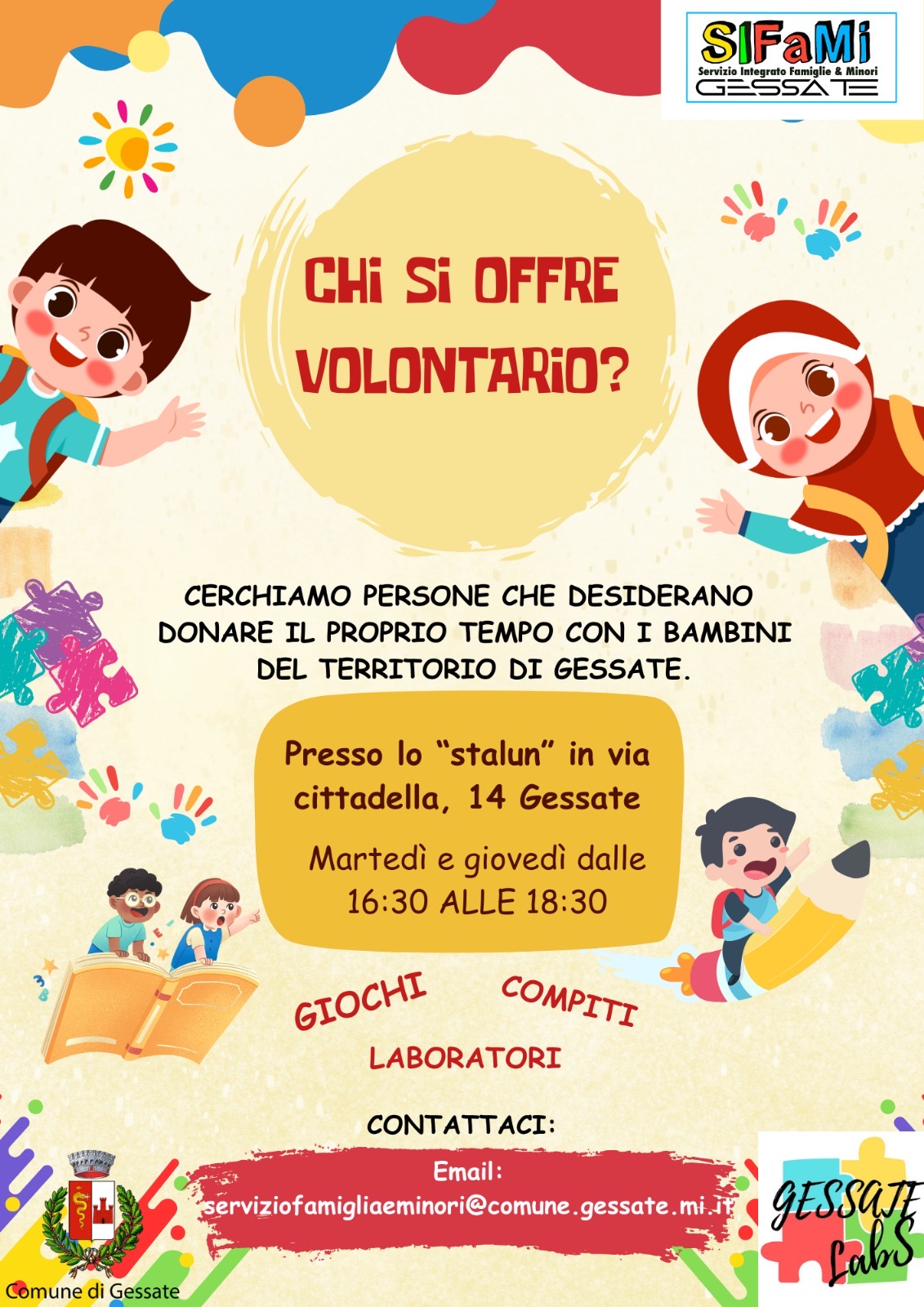 Il Servizio Integrato Famiglie e Minori del Comune di Gessate cerca persone disponibili a dedicare un po’ del proprio tempo ai bambini e alle bambine del territorio nel nostro "Spazio Studio".