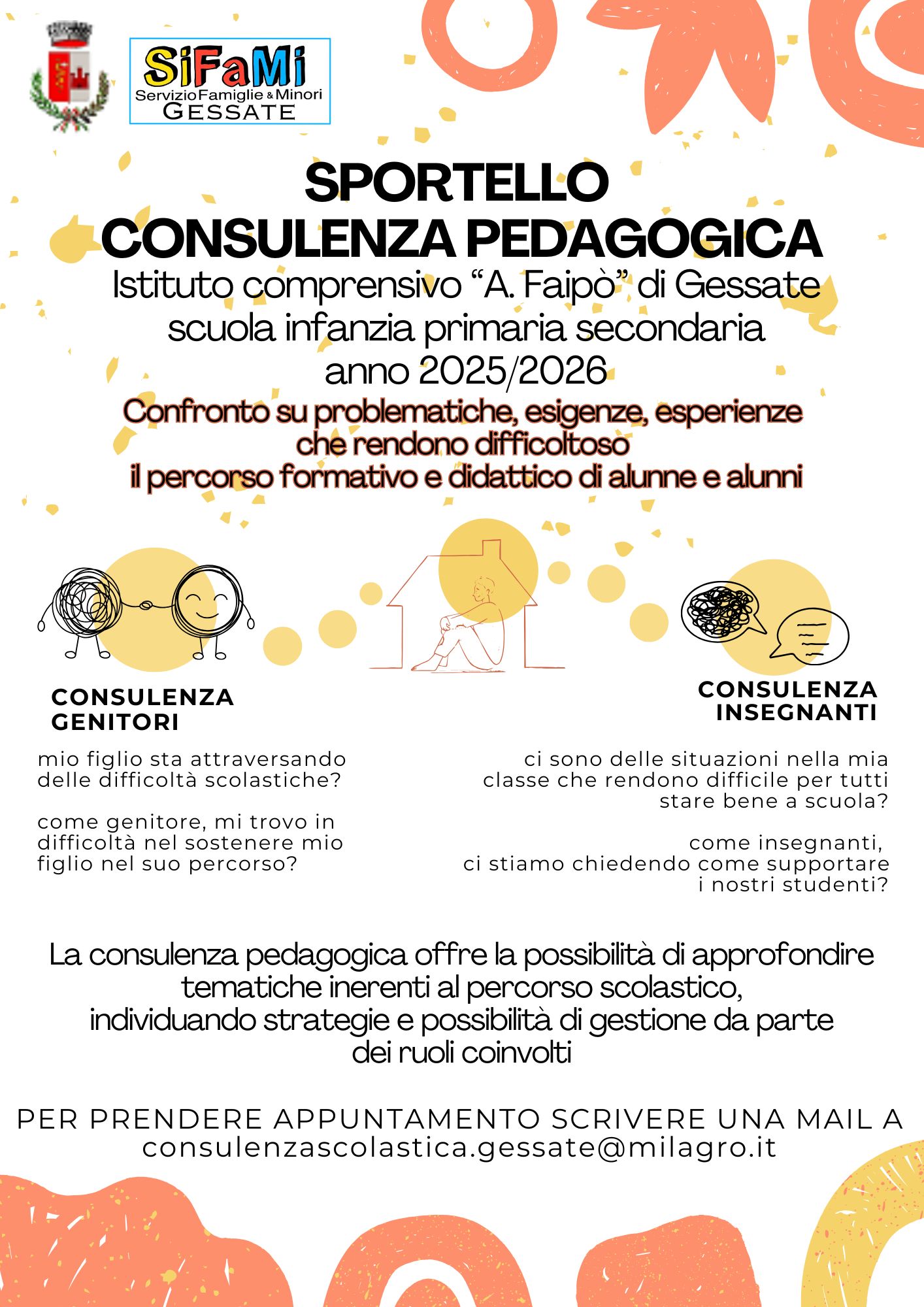 Il Servizio Integrato Famiglia e Minori del Comune di Gessate, in collaborazione con l'Istituto Comprensivo "A. Faipò" di Gessate attiva uno sportello dedicato a genitori e insegnanti della scuola dell’infanzia, primaria e secondaria.